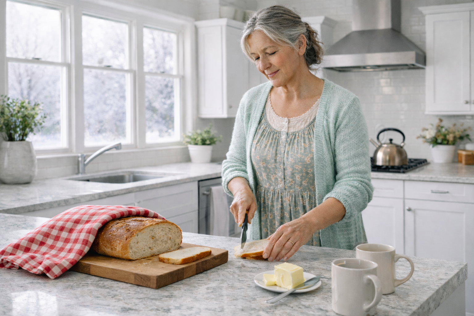 Winter had settled deeper now. The kitchen windows were rimmed with frost, and the morning light came slowly, pale and quiet, as though it didn’t want to disturb anyone. The stove hummed low. A kettle steamed. On the counter, a loaf of fresh bread rested beneath a folded cloth, the smell of it already warming the room.
